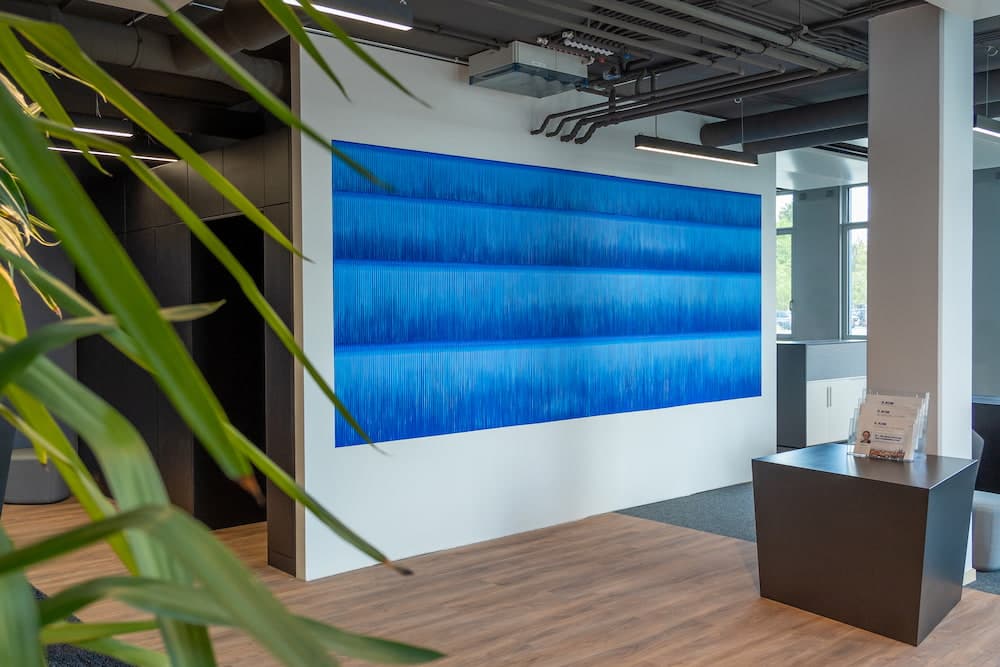 Das Werk „Energiefeld“ nimmt die gesamte Wand unseres Eingangsbereichs ein und schafft durch intensive Blautöne eine Atmosphäre der Ruhe und Energie. Schröder arbeitet mit feinen Linien und Schwingungen, die an digitale Strukturen erinnern – eine Hommage an die Verbindung von Technik und Kunst, die auch bei R-KOM gelebt wird.